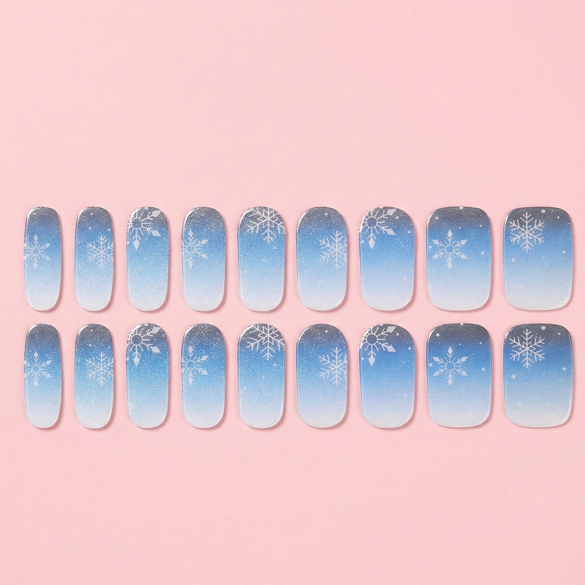 Capture the serene beauty of a winter wonderland! This enchanting set features a seamless ombre gradient fading from a deep twilight blue to an icy, frosted white tip. Adorned with delicate, intricate snowflakes and a subtle dusting of shimmering snow, it delivers a flawless, salon-quality UV gel finish. These semi-cured wraps give you an elegant, seasonal look that cures perfectly under a lamp for long-lasting, durable wear.