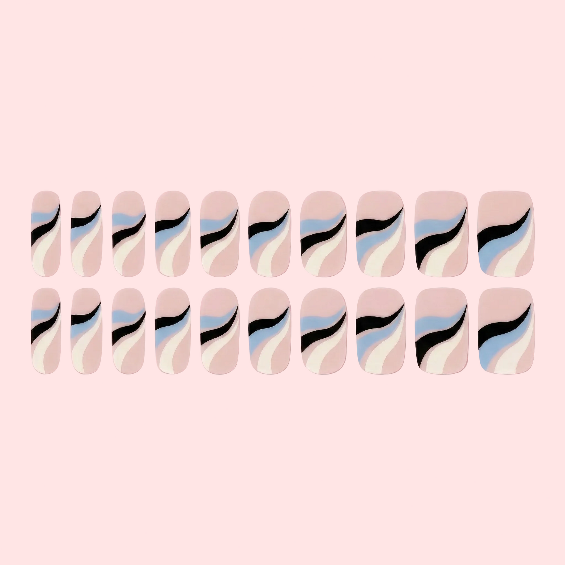 Capture the calming rhythm of ocean waves! This elegant set features a soothing soft nude base adorned with modern, flowing abstract lines in black, crisp white, and tranquil baby blue. Delivering a flawless, salon-quality UV gel finish, these semi-cured wraps give you a chic, minimalist look that cures perfectly under a lamp for long-lasting, durable wear.