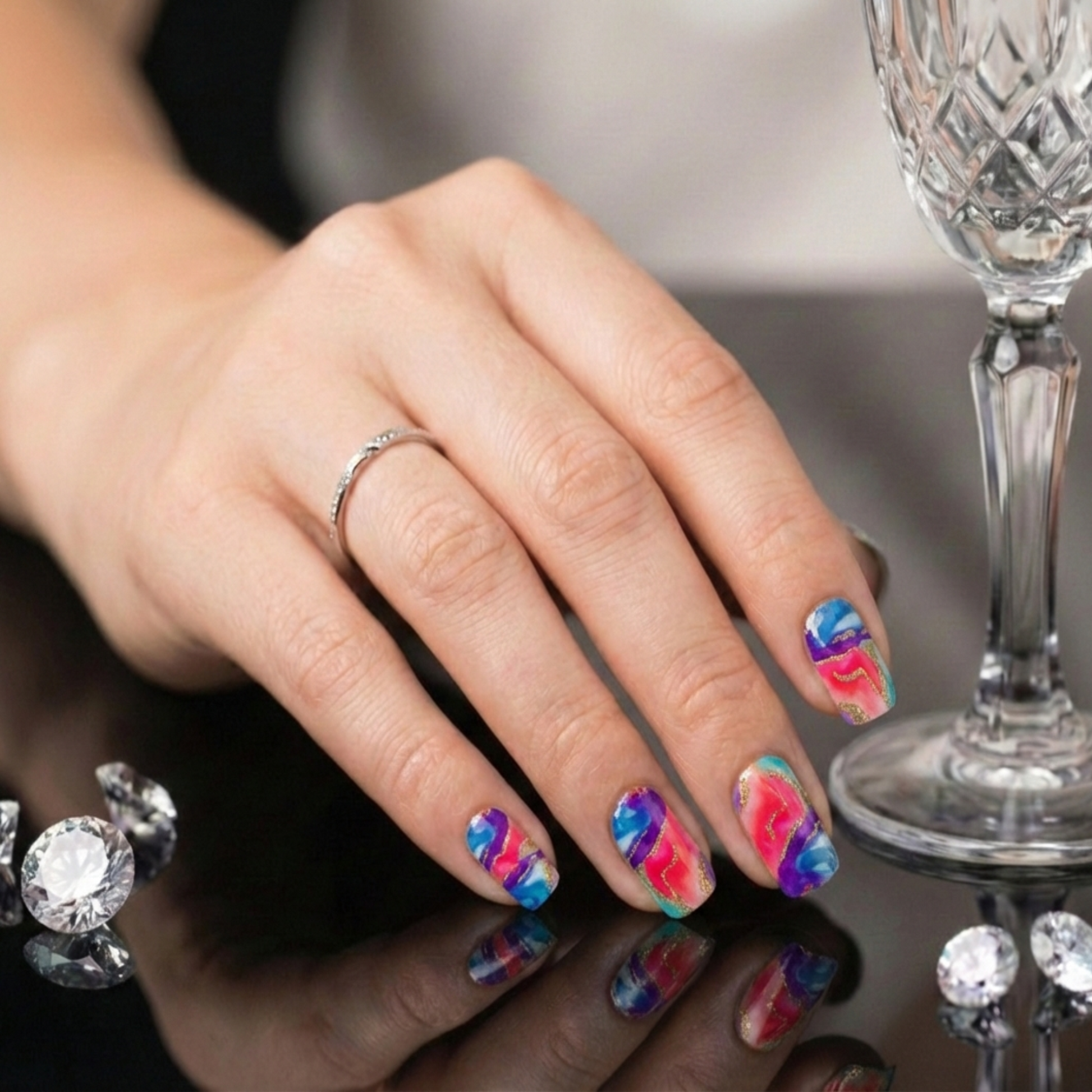 Dive into a vibrant wave of mesmerizing color! This stunning set features a rich, marbled blend of bright pinks, deep purples, and striking ocean blues. Highlighted by delicate, sweeping veins of gold glitter, it delivers a luxurious, geode-inspired masterpiece to your fingertips in seconds.