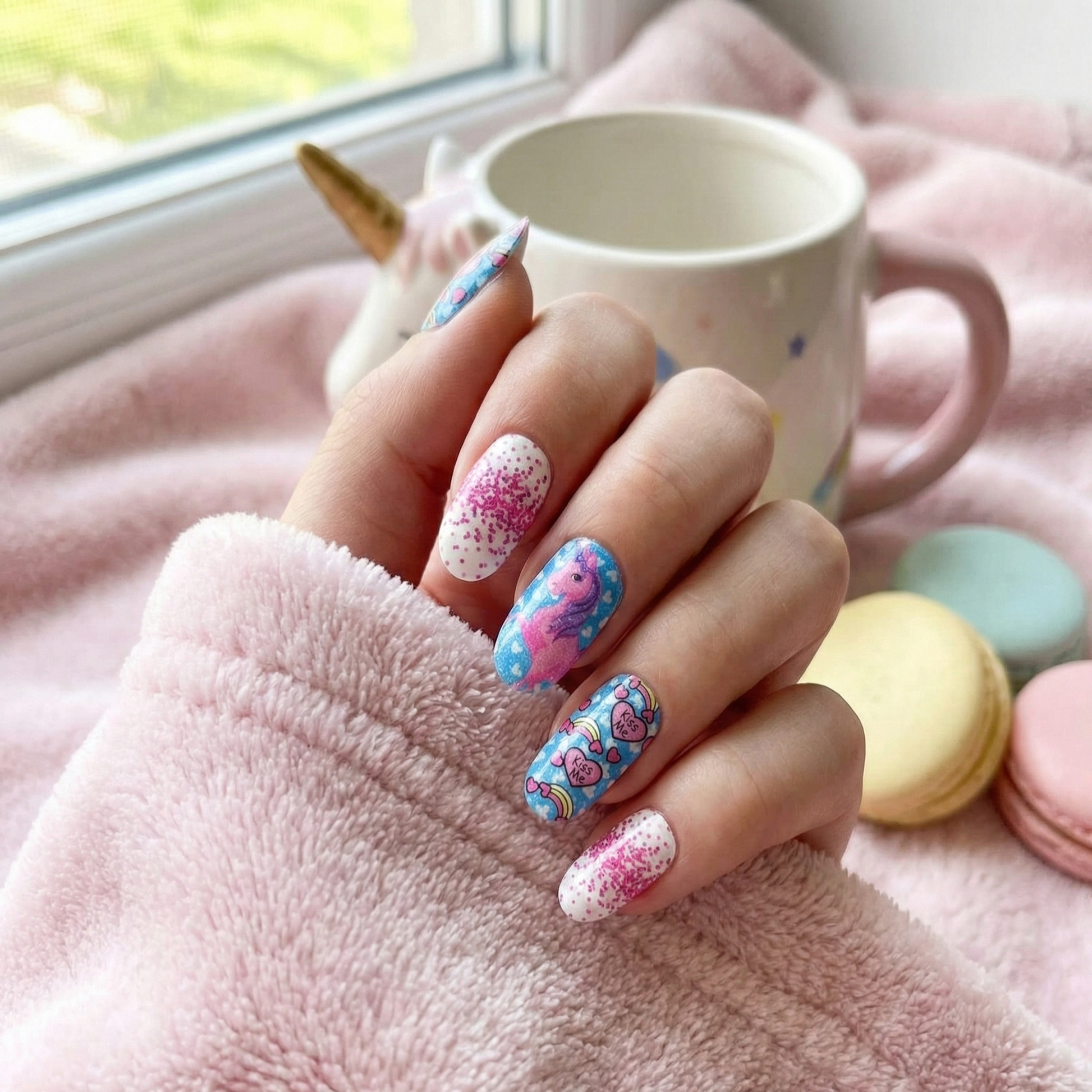 Bring the magic of a fairytale to life! This enchanting set features a soft sky blue and sparkling pink glitter base scattered with vibrant elements: adorable pink unicorns, colorful rainbows, delicate hearts reading "Kiss Me", and playful white and pink polka dots. It’s the perfect magical touch to give your nails a fun, whimsical makeover in seconds.