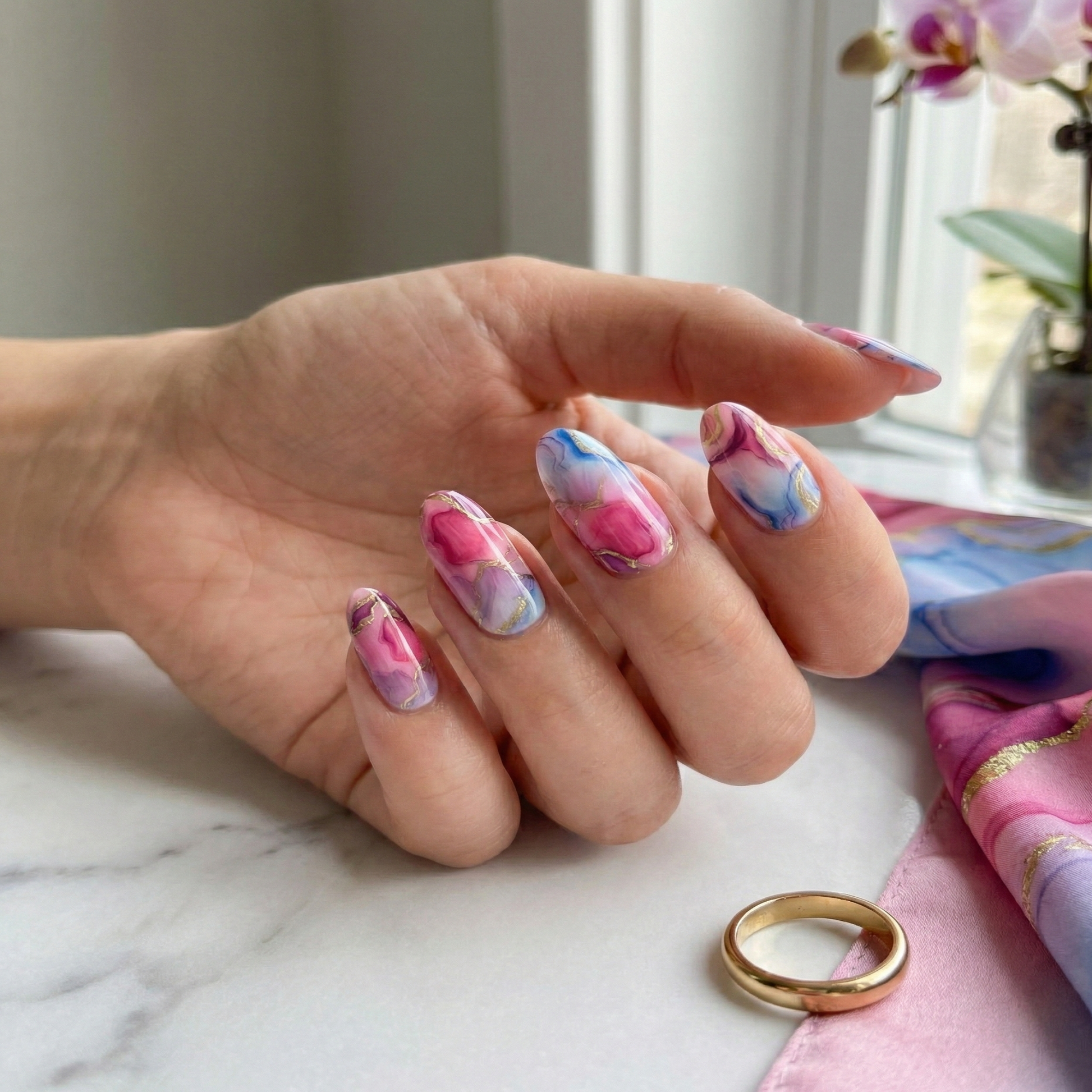 Immerse yourself in fluid elegance! This stunning set features a delicate, dreamy watercolor aesthetic with smooth swirls of soft pink, magenta, and baby blue. Outlined and accented by elegant, crackled veins of shimmering gold, it delivers a luxurious, artisan marble finish to your manicure in seconds.